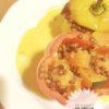 Amíg a quinoa fő a paprikák tetejét levágom, félreteszem; belsejüket “kitisztítom”, eltávolítom a magokat.
