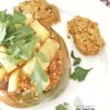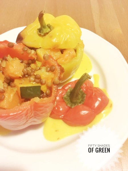 A paprikák tetejét egy éles késsel levágom, kimagozom és fejjel lefelé állítom őket egy konyhai papírtörlőn, hogy ne legyen “leveses”. Majd egy kanállal a tökös-lencsés tölteléket belekanalazom.