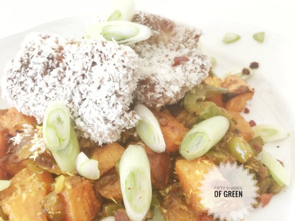 A tököt köretként a tányérre halmozom, jöhet rá a kókuszos tofu és megszórom a sült chilivel és újhagymával.
