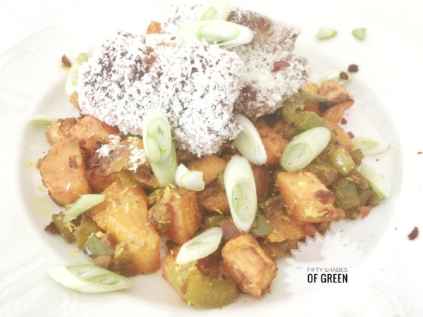 A tököt köretként a tányérre halmozom, jöhet rá a kókuszos tofu és megszórom a sült chilivel és újhagymával.