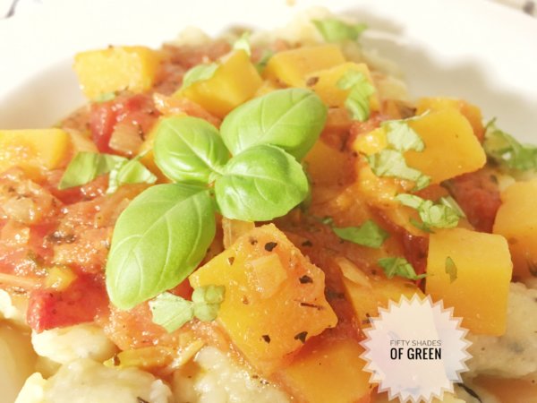 A raguhoz a vöröshagymát finomra vágom és kevés kókuszzsíron megpirítom. Hozzáadom a felkockázott tököt, a paradicsompürét, elkeverem. Hozzáadom a paradicsomot, felöntöm a fehérborral és az alaplével. Felforralom és főzöm, míg a tök megpuhul. Sózom és borssal fűszerezem, és megszórom a friss apróra vágott bazsalikommal.
