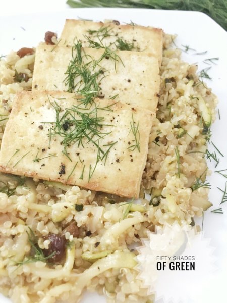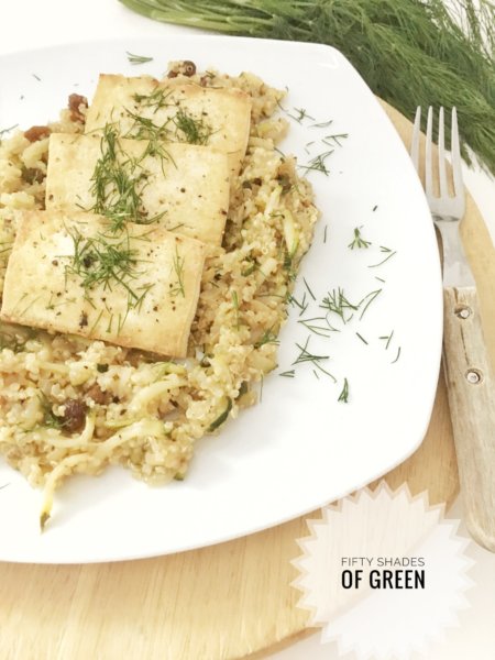 A cukkinis quinoasalátát tányérra szedem, a sült tofu szeleteket rápakolom és az egészet megszórom a friss kaporral.