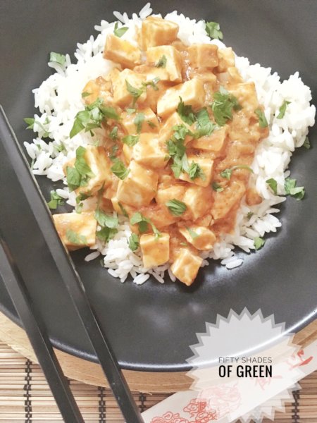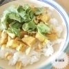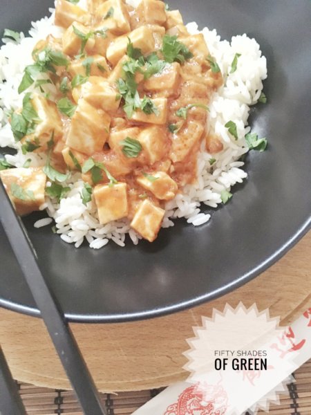 Egy nagy serpenyőben 2 EK kókuszzsírt hevítek. A finomra vágott vöröshagymát és fokhagymát rádobom és 2 percig pirítom. Majd hozzáadom a szójaszószt, ketchupot, agavét és mogyoróvajat és elkeverem. Felengedem az alapléval és felforralom. Hozzáadom a kockákra vágott tofut és meglocsolom a sriracha szósszal. 5-6 perc alatt jól összefőzöm az ízeket.